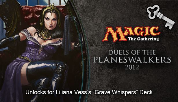 Liliana Vess’s fully unlocked “Grave Whispers” black deck for Magic: The Gathering — Duels of the Planeswalkers 2012. Long ago, Liliana made a deal to guarantee long-lasting life and beauty. Now, she specializes in necromancy: spells that reanimate the dead and unlock power from death. Harness that power by mastering a horde of zombies, skeletons, and other ghoulish creations. Cripple your opponent with discard spells, then bring their best creatures back from the dead to fight for you.