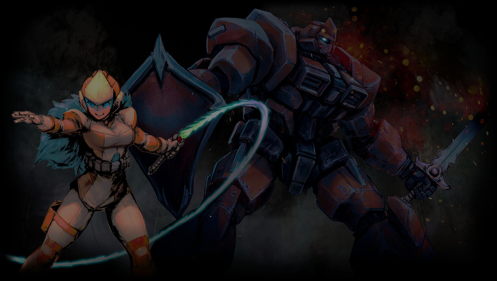 In anticipation of such unforeseen Earth-threatening events, the International Security Council formed Gauntlet, a science committee developing super-sophisticated defense technologies. Gauntlet discovers that denizens of the Netherworld can only be defeated by their own weapons. Spirit Weapons are forged with spirits of the deceased and humans can’t brandish them without becoming corrupted by their foul energy... However, a machine would be immune to demonic corruption! Gauntlet recommissions Flame, a former rescue operations android, to become a Squire. She takes control of Grit, the last remaining Paladin unit — a state-of-the-art suit of power armor capable of wielding Spirit Weapons.