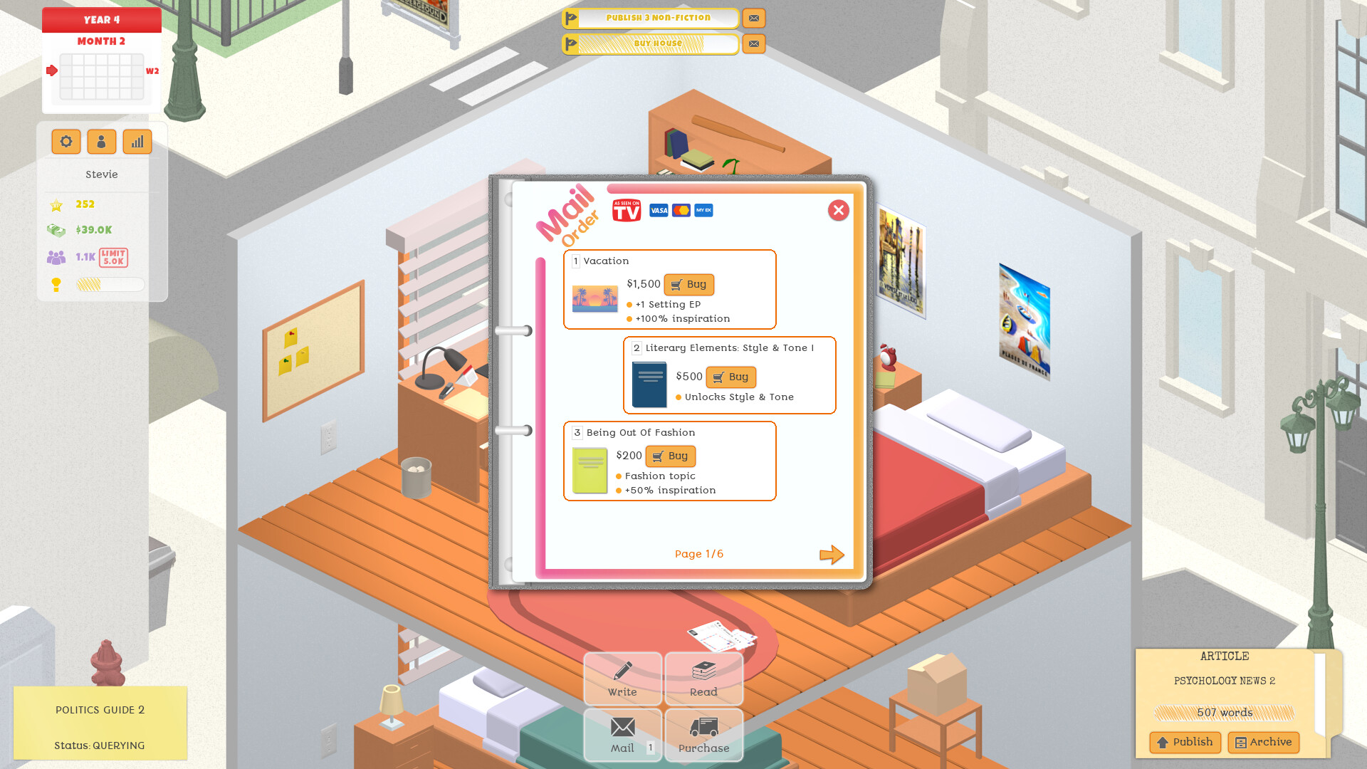 As you gain experience, you unlock new work types, genres, topics and purchasable items which provide you with perks, allowing you to improve your works and progress in the game.
