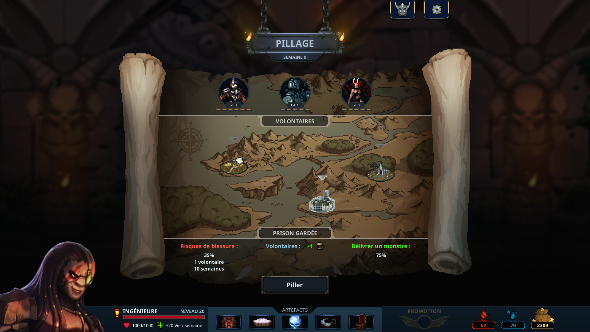 Il faudra d'abord planifier votre défense contre des aventuriers. Vérifiez leurs caractéristiques et résistances, puis placez les pièges et monstres les plus à même de gagner. Une fois votre donjon en place, que l'exploration commence !