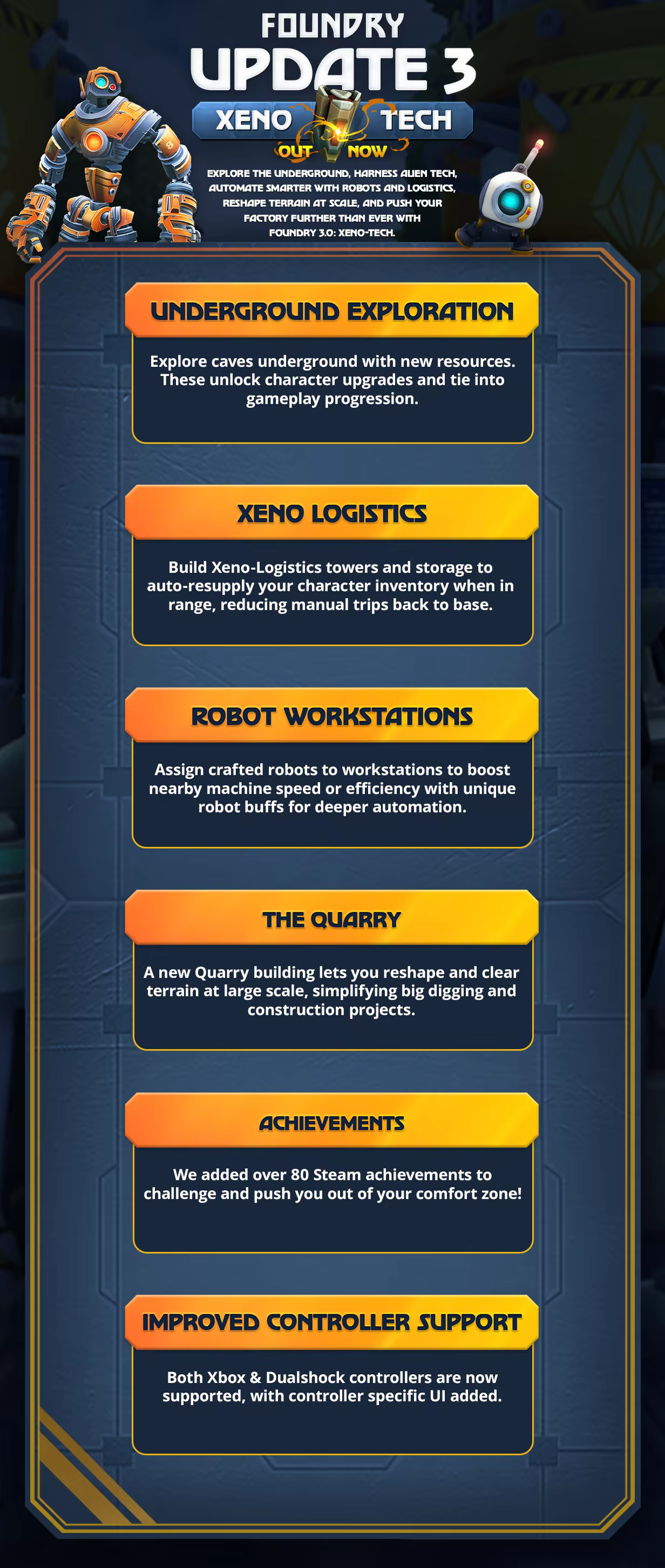 FOUNDRY is a first-person (first-robot?) factory builder with complete creative freedom set in a procedurally generated and infinite voxel world.