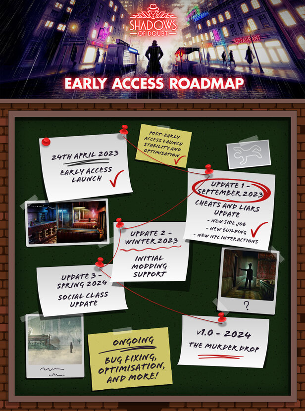 “The full version of Shadows of Doubt will include additional content and optimisations that will be introduced throughout Early Access. We are currently planning to add new content such as new and improved cases, new locations and new citizen interaction options, along with a more rounded and polished game experience.