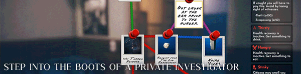 Shadows of Doubt is set in an alternate reality in the hyper-industrialized 1980s. Think like a detective and use a variety of gadgets as a private intelligence investigator, gathering evidence and making money by solving cases, finding and selling information and more.