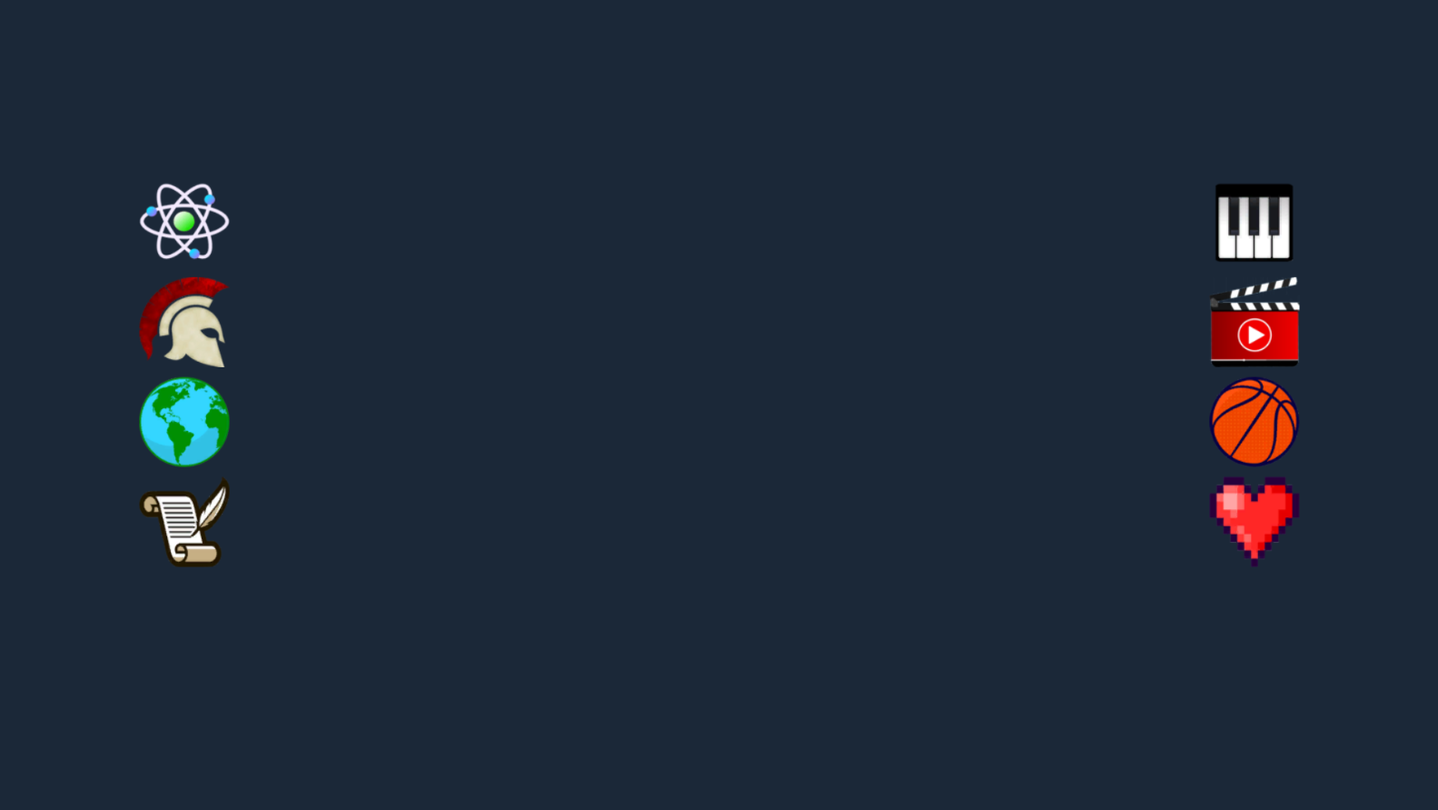 • 💡 Equal parts pop-culture and academic trivia from the following categories: Movies & Television, Literature & Fine Arts, Games, General Knowledge, Geography & Politics, History, Music, Science & Technology, and Sports.