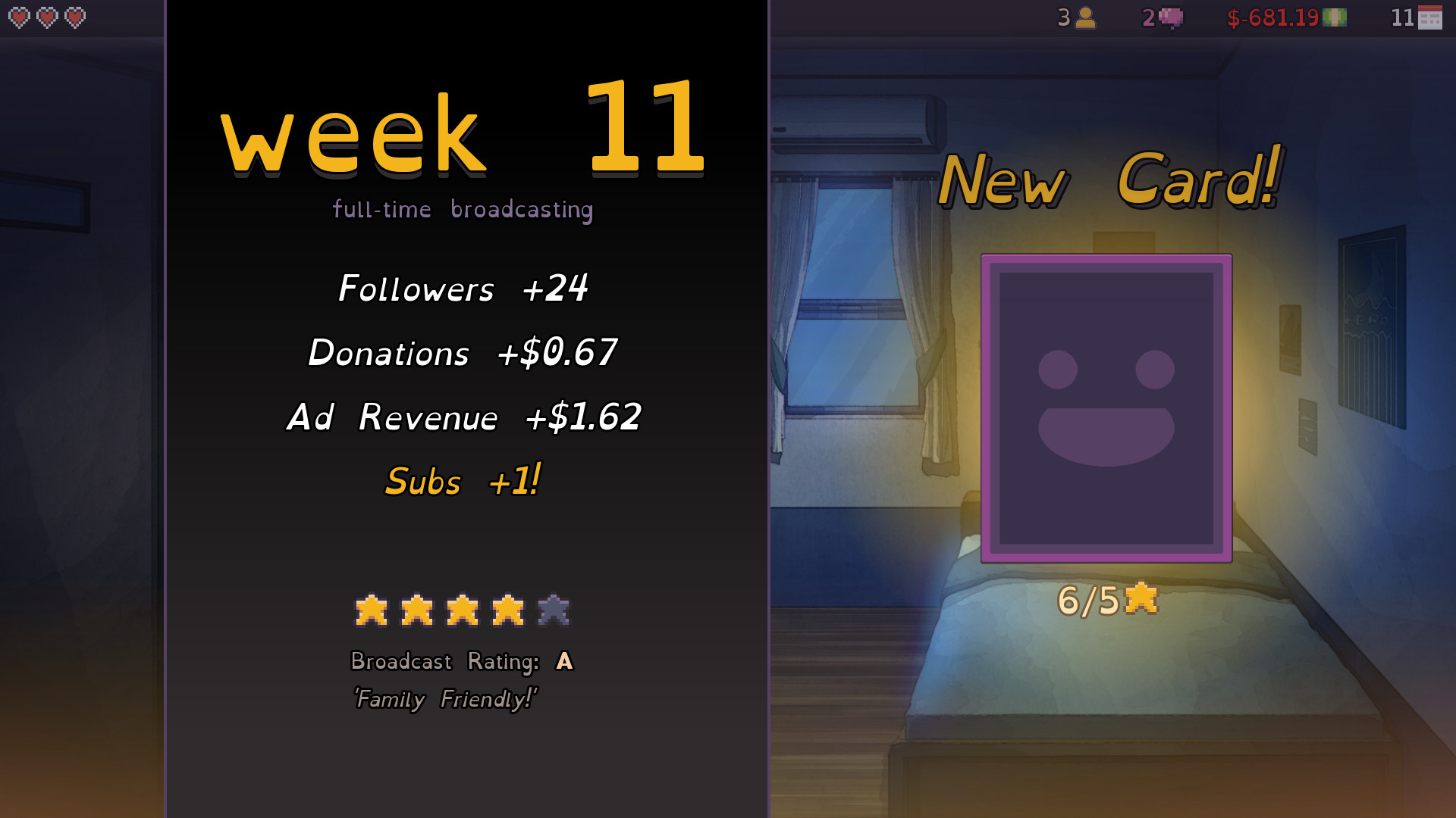 Story card game about playing games all day and proving your father wrong. Build your stream, keep your mental health above zero, and work your way up to a minimum wage!