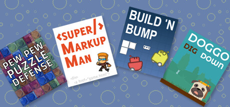 Get the first four games developed by Roppy Chop Studios! Jump on your robot friends. Dig holes as a cubic dog. Build towers to fend off infinitely descending puzzle blocks. And then round things off with a few HTML and CSS exercises!