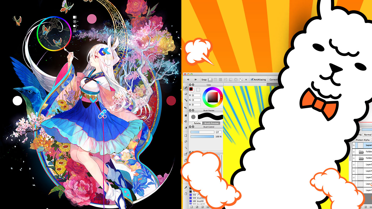 "openCanvas7" is equipped with analog-like brush strokes, functional yet user-friendly interface, and unique "Event" function that enables to record/replay/edit the drawing progress.