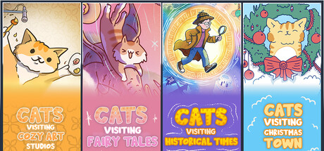 Join a delightful group of adventurous cats as they explore four charming destinations! From painting masterpieces in Art Studios, spreading holiday cheer in Christmas Town, chasing magic in a Fairy Tales realm, to strolling through Historical Times, this bundle brings whiskers, wonder, and warmth to every corner. Perfect for cat lovers and cozy gamers alike!