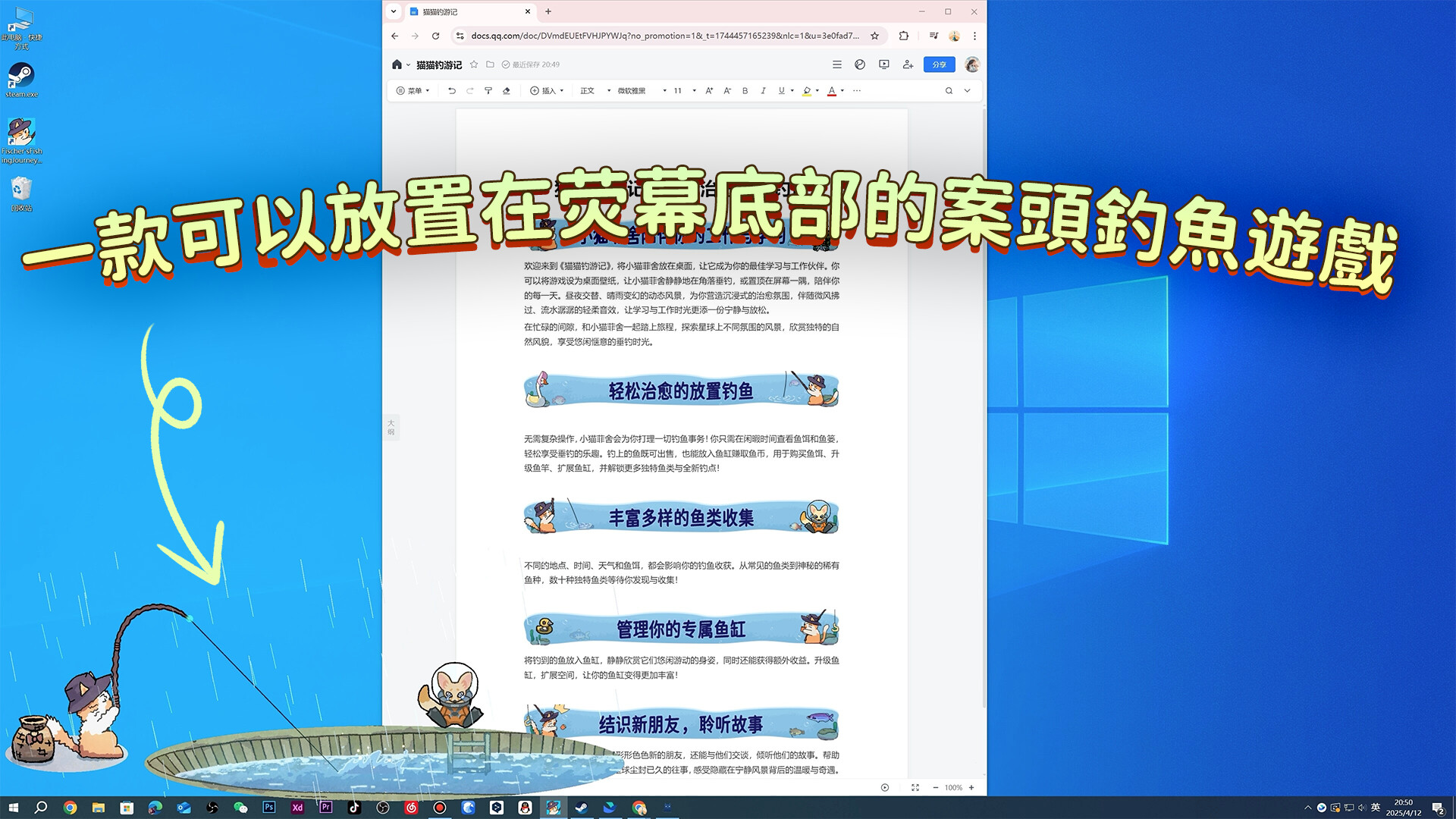Put Fischer on your desktop as your ultimate study and work buddy. He'll fish quietly in the corner, taking care of it all—you just drop in occasionally to collect your rewards, unlock new fish, upgrade your rod, while enjoying that calming, healing atmosphere.