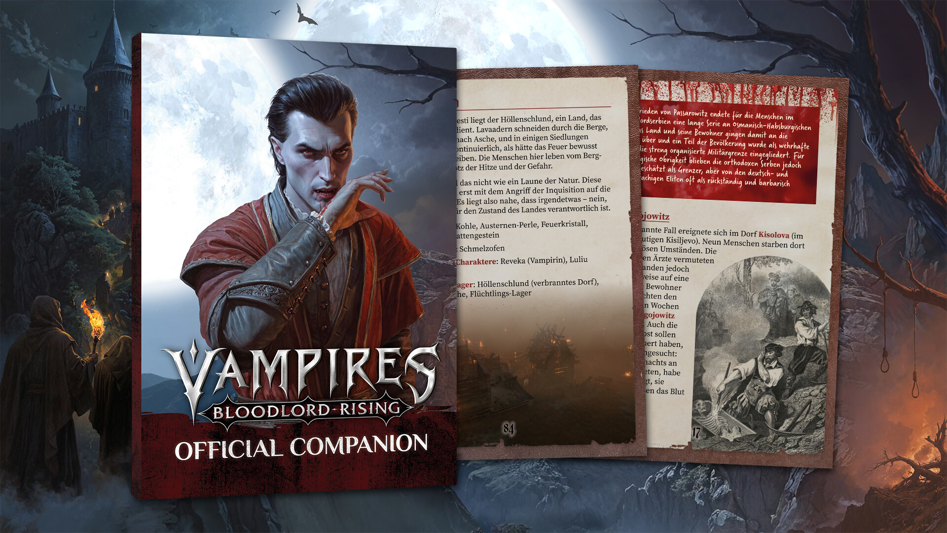 Lass dich auf deinem Weg nach Sangavia nicht täuschen! Die Companion Edition enthält Vampires: Bloodlord Rising sowie das sorgfältig gestaltete, offizielle Begleitbuch mit hilfreichen Hinweisen, Guides und Hintergrundinformationen zu Vampires: Bloodlord Rising.