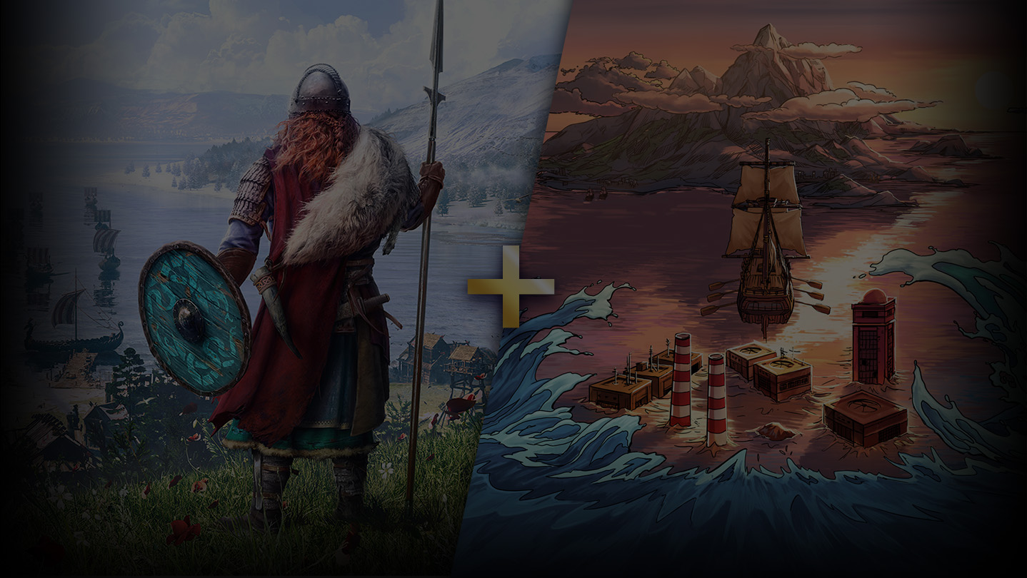Then sail north to Frozenheim, where you lead a Viking clan to new shores. Build, expand, and manage a growing settlement in the harsh fjords. Prepare for brutal winters, gather resources, and defend your people against rival clans.