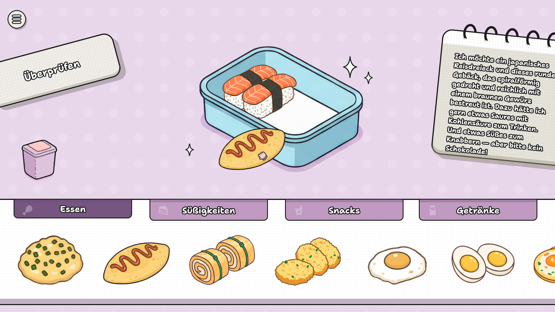 - Pack my LunchBox: Das Hauptspiel. Es erwarten Sie 50 Levels, in denen Sie Speisen und Leckereien perfekt in kompakte Boxen nach den Vorlieben der Kunden einpacken müssen.