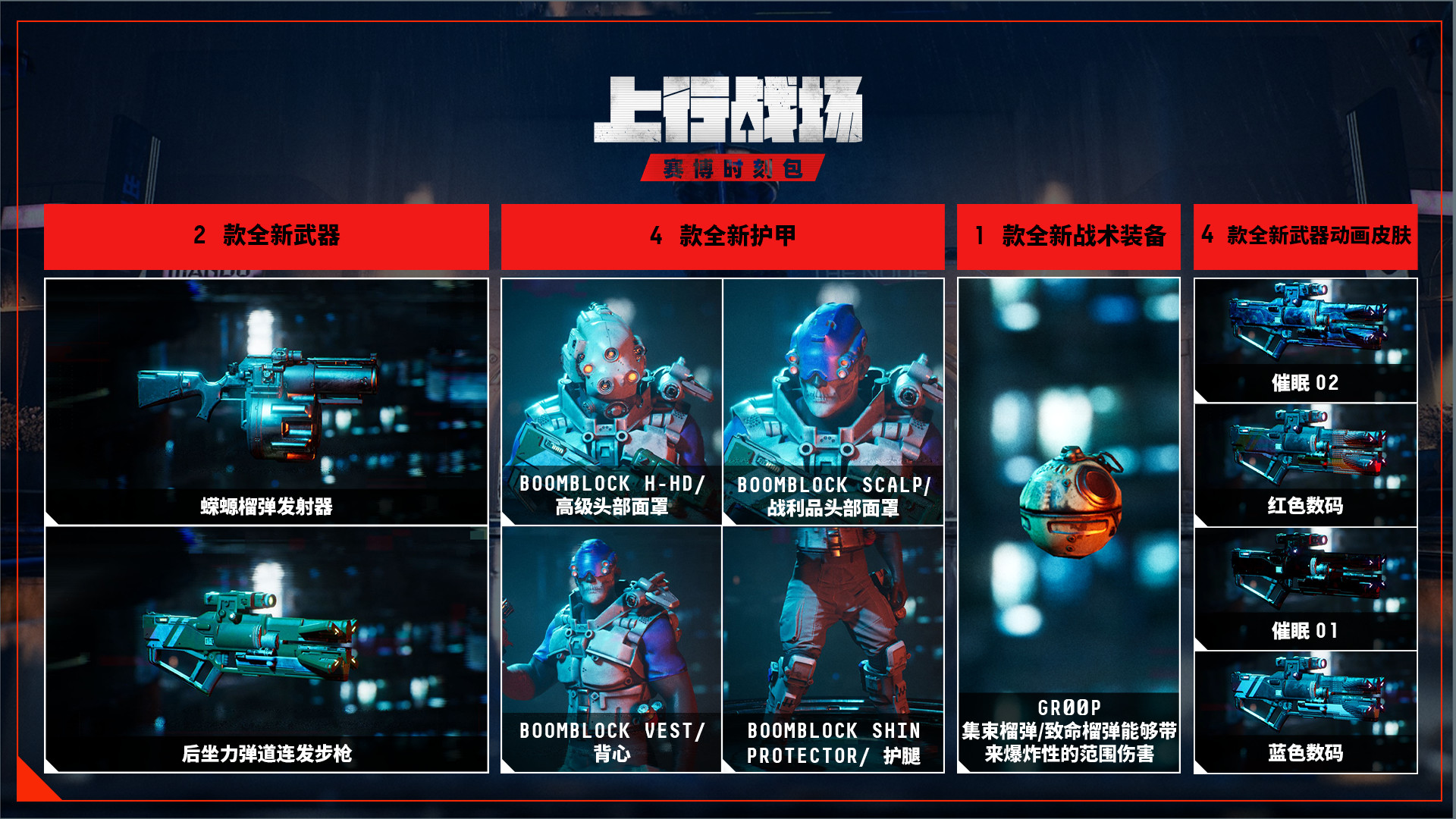 You’re probably thinking, but what about my head? CyberSec has you covered, with the Boomblock Scalp for Medium Head Protection and the Boomblock H-HD for Advanced Head Protection. And to look extra cool, four new animated weapon skins: Blue Digital ; Hypno 01 ; Hypno 02 ; Red Digital.