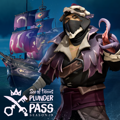 Purchase a Sea of Thieves Plunder Pass and unlock the ability to earn extra Seasonal rewards as you rack up Renown on your adventures! Season 19's Plunder Pass contains the Kraken's Ruin ship set including Collector's Figurehead and Sails, the Kraken's Ruin Hook, Jacket and Mask for your pirate, and 750 Ancient Coins earnable in stages (in addition to the 250 earnable through Seasonal progression without Plunder Pass ownership). All cosmetics included are new to the seas, not even the Emporium has them in stock yet!