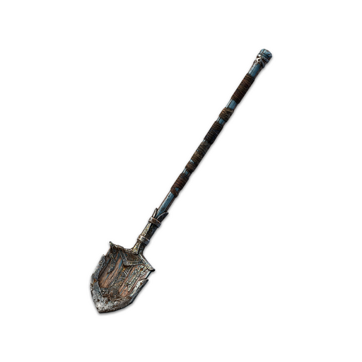 Soft straps of tanned hide cover this thin, lacquered handle. It is topped by a strange, yet familiar symbol: Jhode's diadem and Jomfru's signs resembling sharpened knives. The iron is of high quality and clearly of Gottlung origin, but the white stripes of salt carved into the scratched steel recall the distant northern shores where this tool was forged.