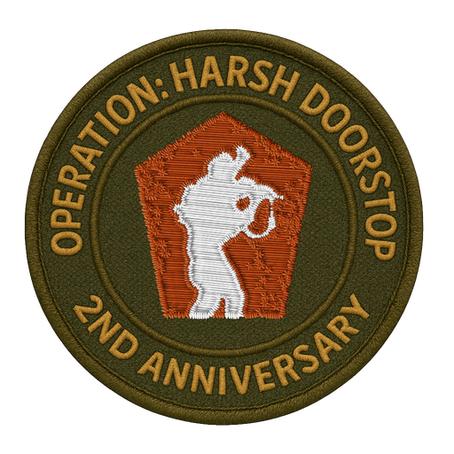 A limited-edition embroidered patch commemorating the 2nd anniversary of Operation: Harsh Doorstop. A symbol of loyalty and dedication to the project’s ongoing mission.