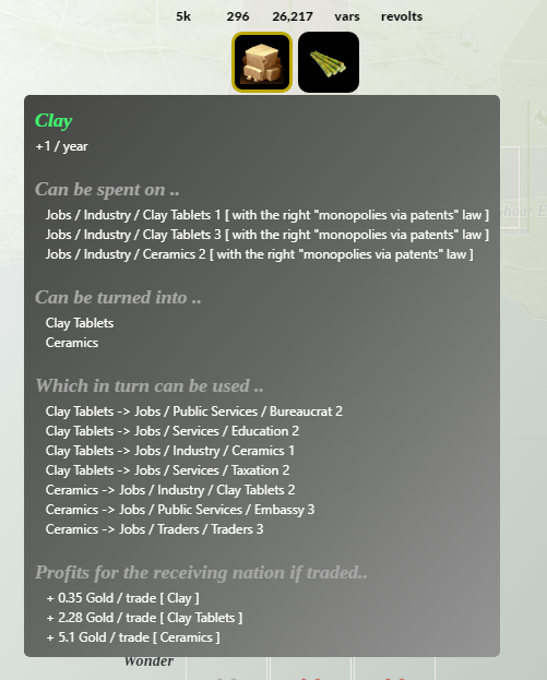 Resources are found in provinces by acquisition or exploration. They can then be manufactured into other types of resources using jobs. They can be traded or used to unlock tiers of your economy: