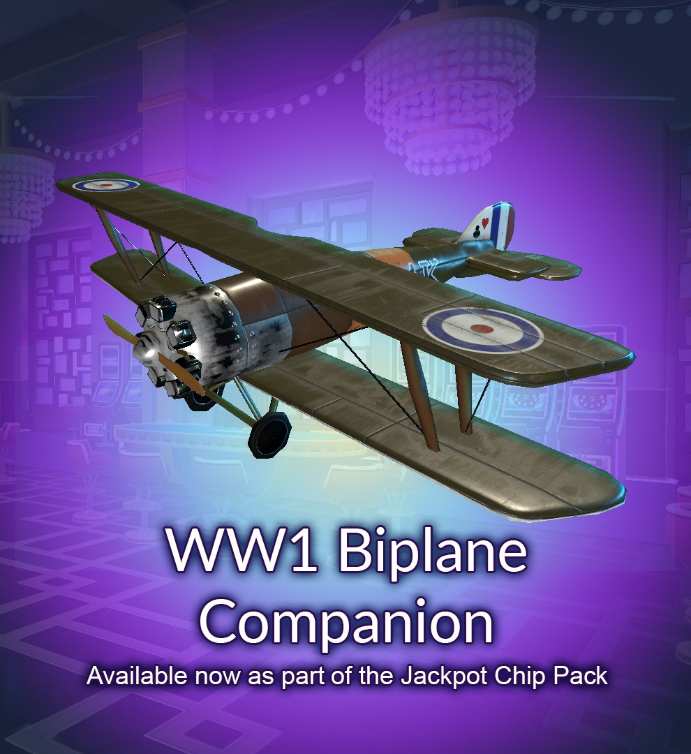 This is one Ace High that will always have the upper hand! The WW1 Biplane Companion is here to provide you some aerial support. Recruit your agile new buddy by purchasing the Jackpot Chip Pack during the month of November, available now at the Cashier!
