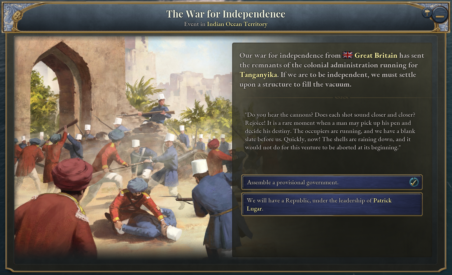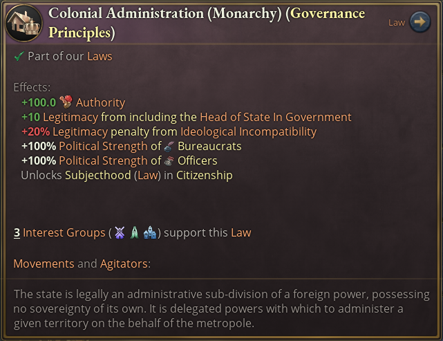 If a civil war occurs in a Colonial Administration, the revolutionary \[or secessionist] side will receive an event that allows them to choose a different Governance Principles law. A similar event will occur if a colonial administration ever becomes independent.