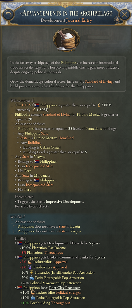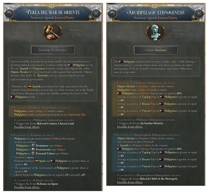 The second Journal Entry, Archipelagic Ethnogenesis, is all about the creation of a pan-Philippinic national identity, and will grant you powerful assimilation bonuses as a reward –  on top of the creation of a new national culture. Depending on your relationship with Spain, this culture's language can either be Hispanophone or Philippinic.