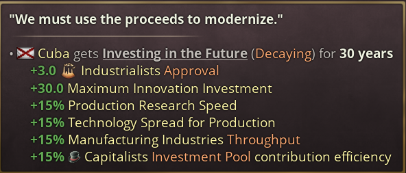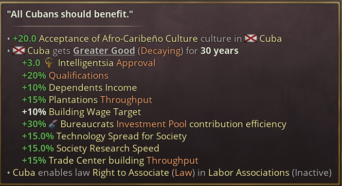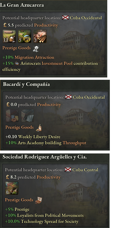Cuba's trade focused playthrough also benefits from three powerful companies, allowing access to prestige goods: Havana Sugar, Bacardi Rum, and Cigars.