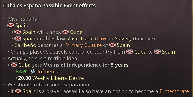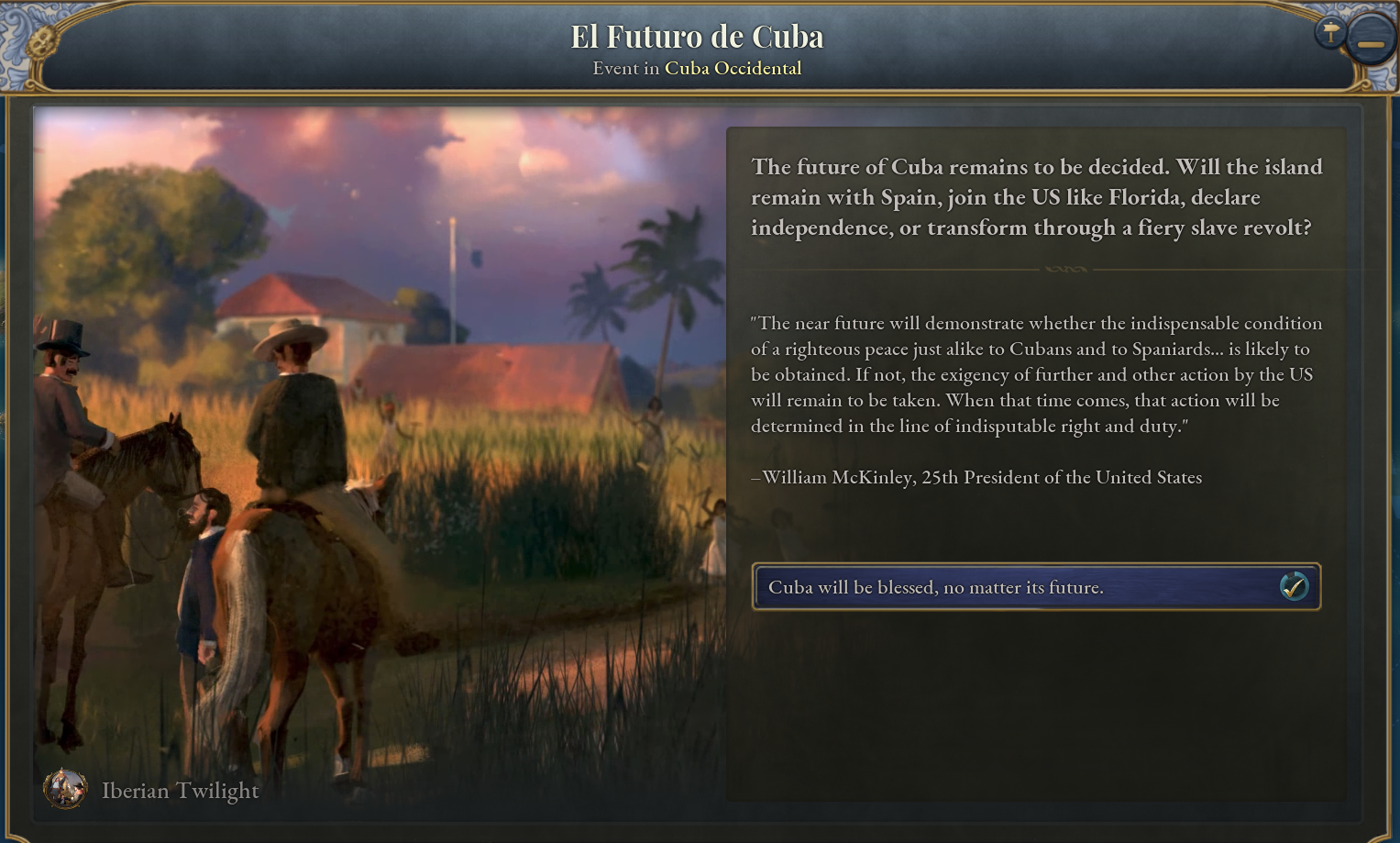Greetings, I am Lufthansi, narrative designer on Victoria 3, and welcome back to this week's 100% planned Dev Diary. This will contain the material that we were unable to squeeze into last week's Dev Diary felt warranted a separate, more detailed introduction. So today we will cover everything from the colonial law variants and electoral fraud arriving with the free patch, to the new paid narrative content associated with countries in Spain's wider orbit - namely Cuba, the Philippines, Morocco, and the Dominican Republic.
