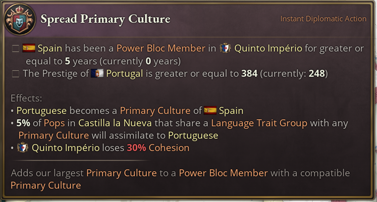The leader of a Cultural Commonwealth may use the Spread Primary Culture action to spread their primary culture to a less prestigious member of the bloc that shares a Language or Language Group trait with that culture.