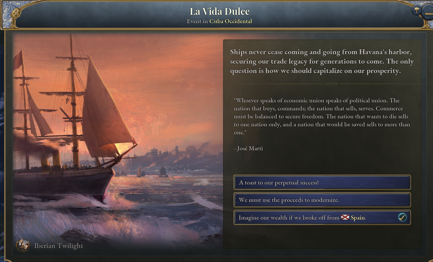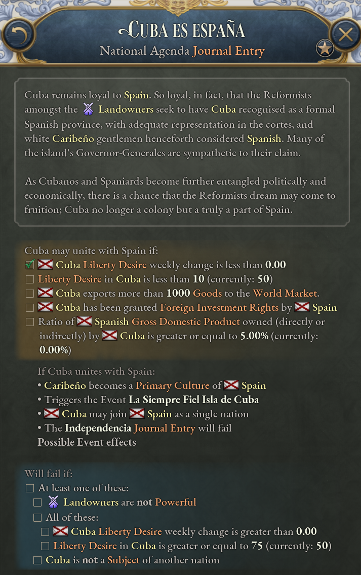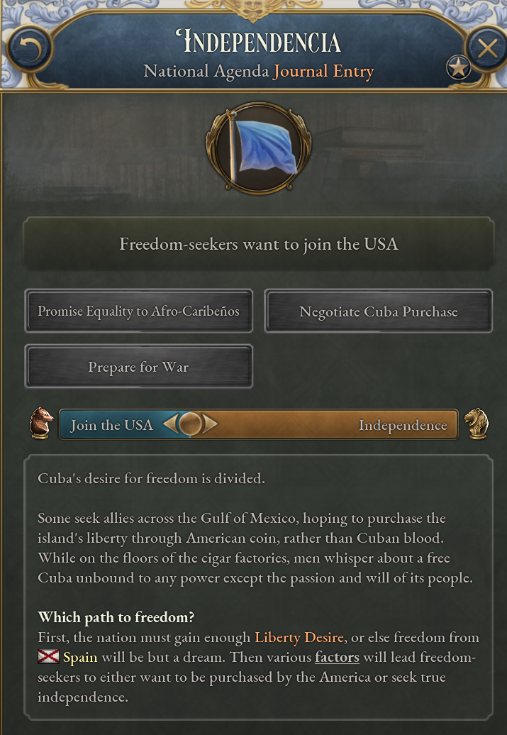 These possible outcomes are represented by the Independencia Journal Entry. Here, depending on a number of factors, the spirit of liberty will either drive freedom-seekers to uniting with the USA, or to follow Jose Marti's call for true independence.