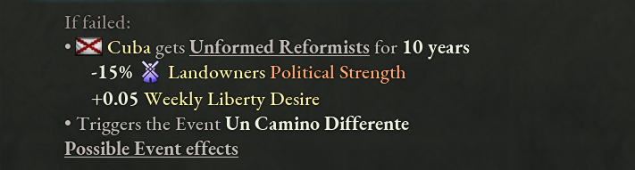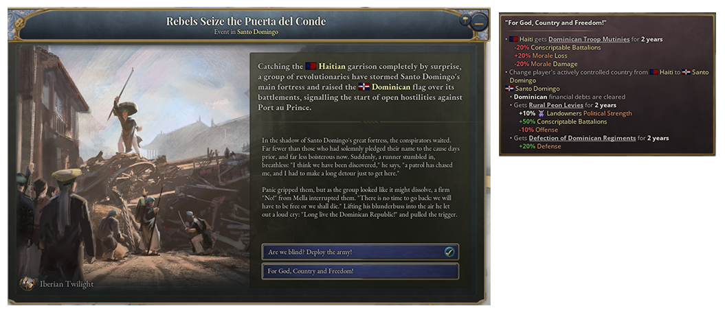 In turn, the start of a Dominican Secession will cause the Journal Entry to fail, and Dominican rebels to rally behind the great landowner Pedro Santana, whose strong leadership, wealth, and access to large numbers of labourers-turned-militiamen would be a decisive factor in the historical Dominican War of Independence.