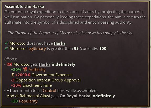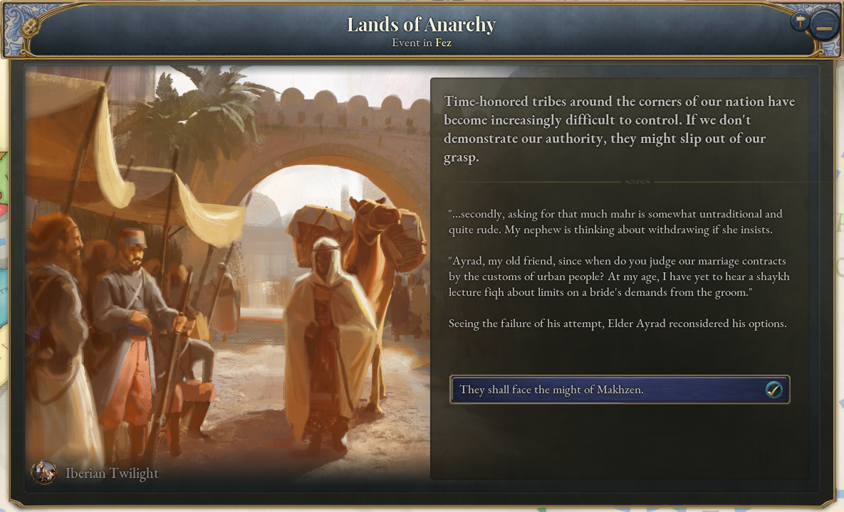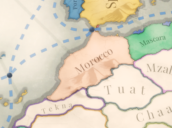 At the start of the game the ruling Alaoui dynasty of Morocco had fairly limited control over the territories that we recognize as Morocco on the map at game start, while able to extract tribute from the surrounding tribes and being at least nominally and religiously recognized as ruler of the region the government's ability to enforce its laws upon the tribes was rather limited past the capital Fez and the cities along the Atlantic coast as well as Marrakech.