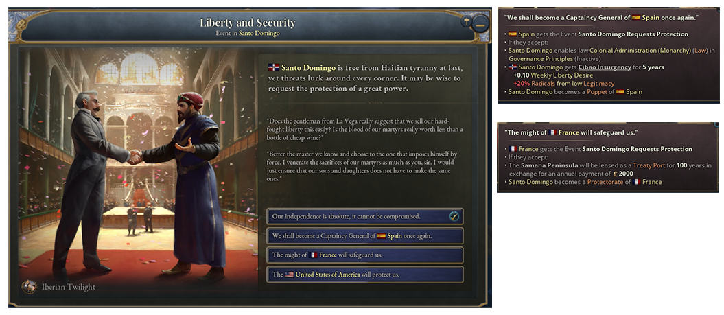 Once independent, the new Dominican Republic may seek protection from a foreign power, to safeguard its territorial integrity against Haiti. Historically, Pedro Santana and his supporters would sideline advocates of full Dominican Independence and petition Spain for annexation, but there were also those who argued that Santo Domingo should seek the protection of France or the United States instead. The latter however, would come at the cost of the establishment of the lease of the Samana peninsula, whose location and ability to support port facilities made it quite desirable in the eyes of American and French statesmen and naval officers. You can, of course, still choose to rely on your own strength instead.