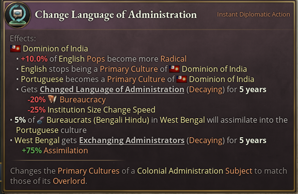 As an additional improvement to colonial administrations, we have added a new diplomatic action. The Change Language of Administration action is included in Sphere of Influence, and allows a colonial overlord to change a colony’s primary culture to match one’s own. If, for example, Portugal is to come into possession of the formerly British Raj, she may use this interaction to switch out the English-speaking administration for a Lusophone one.