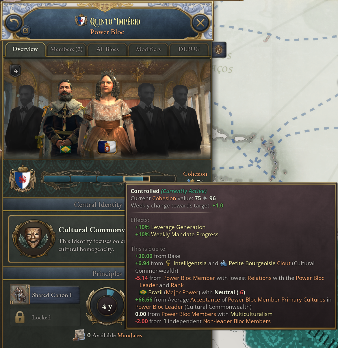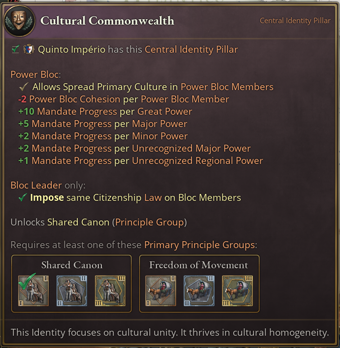 The Cultural Commonwealth is a new central identity for Power Blocs, unlocked by Iberian Twilight. The Cultural Commonwealth is to culture as the Religious Convocation is to religion, encouraging homogeneity amongst a Power Bloc’s member states.