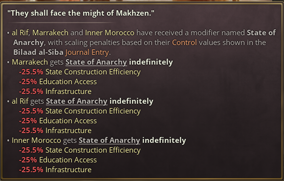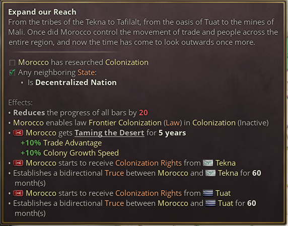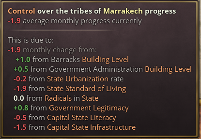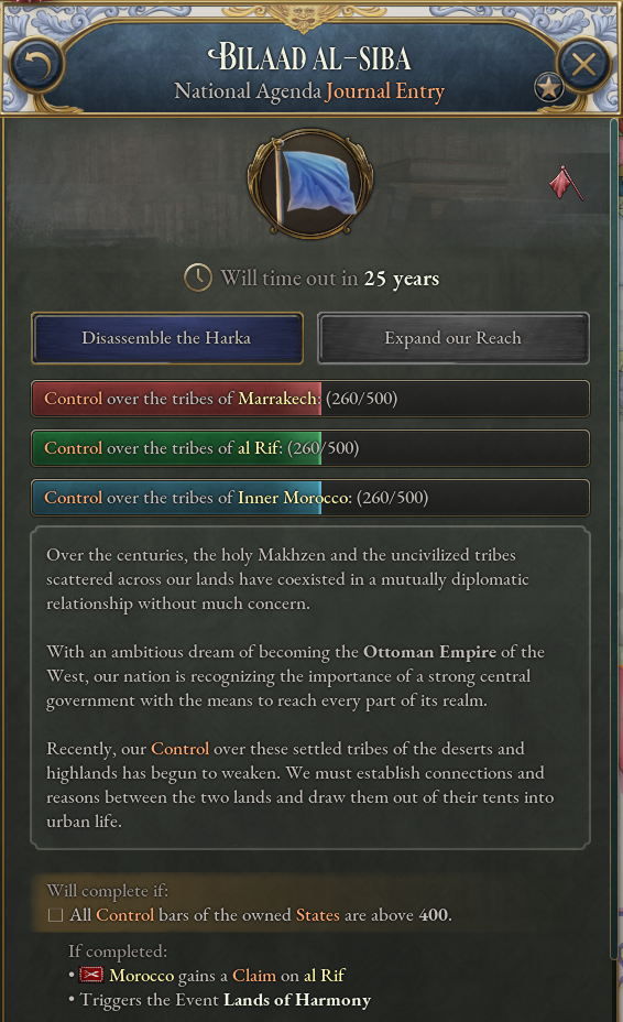 In this journal entry you will be tasked with establishing your control over the tribes of Morocco, to that end we have grouped them up by state regions and created a progress bar for each of them.