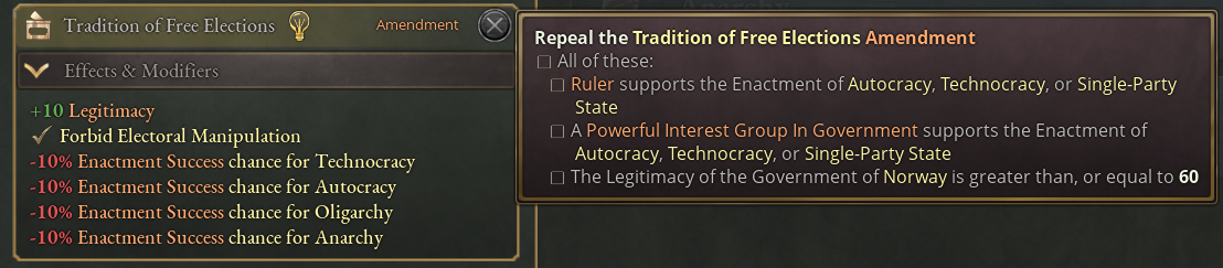 Electoral manipulation has now been made available for all nations, except for ones with the Tradition of Free Elections amendment. The Tradition of Free Elections amendment is gained through the same means that Electoral Clientelism is abolished – if one chooses to not rig one’s elections for enough elections in a row, one will lose the option to do so until a sufficiently autocratic ruler takes power. This Amendment both increases Legitimacy and makes it more difficult to enact a non liberal-democratic Distribution of Power law.