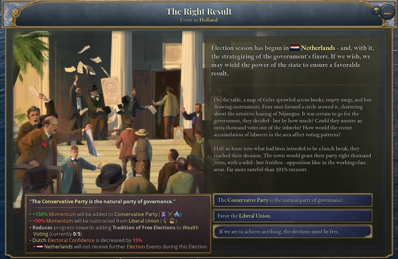 At the start of an election period, countries that do not possess the Tradition of Free Elections amendment will receive an event that gives the option to rig the election for a party of their choice. Doing so will sharply reduce Electoral Confidence. The event shown in Dev Diary #163 remains as the specific variant for Hispanophone and Lusophone countries, whilst all other countries receive the below event.