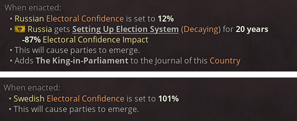 Upon a country enacting an electoral law for the first time, it will start with a level of Electoral Confidence calculated on the basis of its literacy and urbanisation rates, and any local electoral institutions – such as Elected Bureaucrats – that it possesses. Countries that start with low Electoral Confidence will also start with a grace period to raise their Electoral Confidence as much as possible before the full legitimacy malus kicks in.