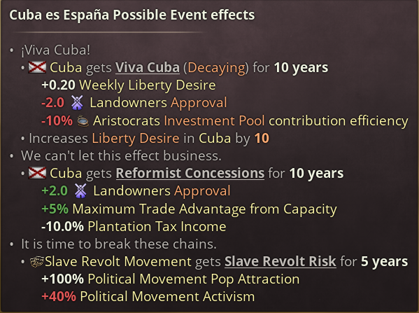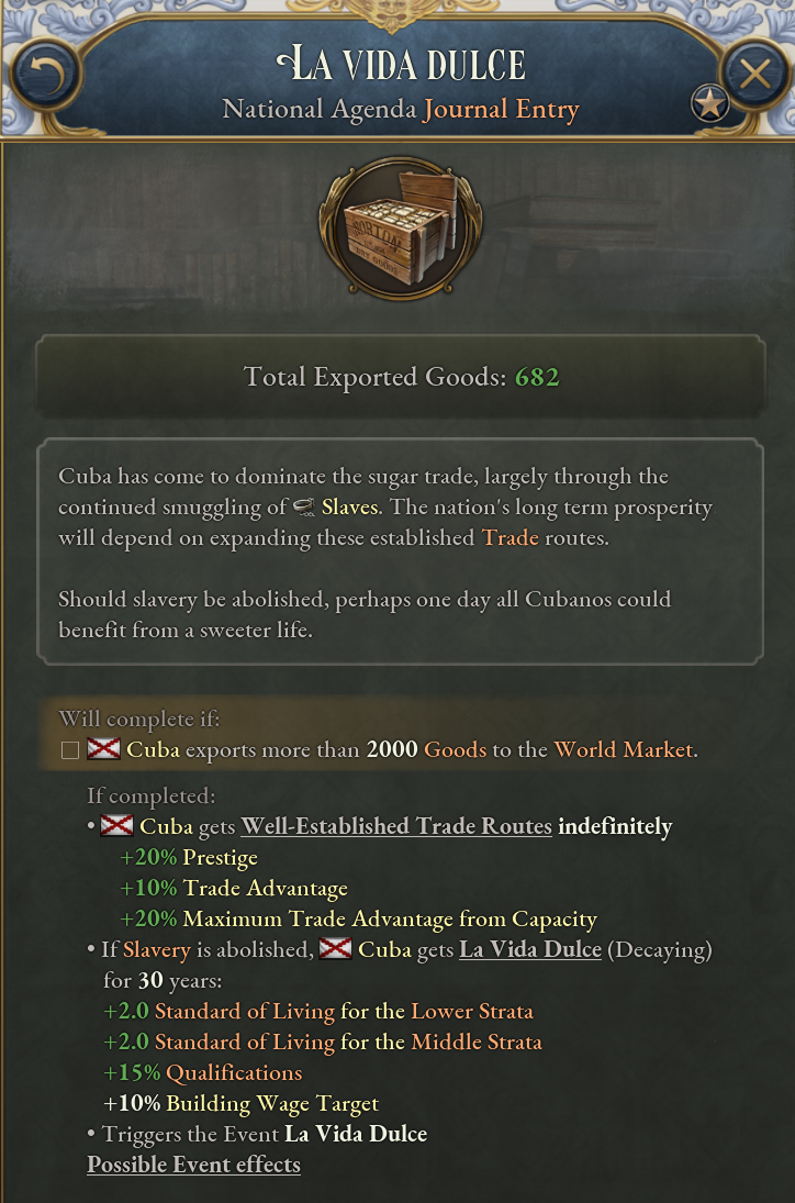 The slave trade in Cuba continued to flourish not because of massive expansion of the sugar industry, but because it was considered cheaper to replace slaves than to provide facilities enough to keep them or their children alive. Only after the cost of slaves increased drastically, and technological improvements achieved the production of sugar with less labor, did the reliance on the slave trade decrease and the abolishment of slavery begin in earnest. In game, this is mechanically represented through the new production methods covered by last week's Dev Diary 163: The Fine Print, and the Journal Entry La Vida Dulce, which also attributes the islands natural trading potential.