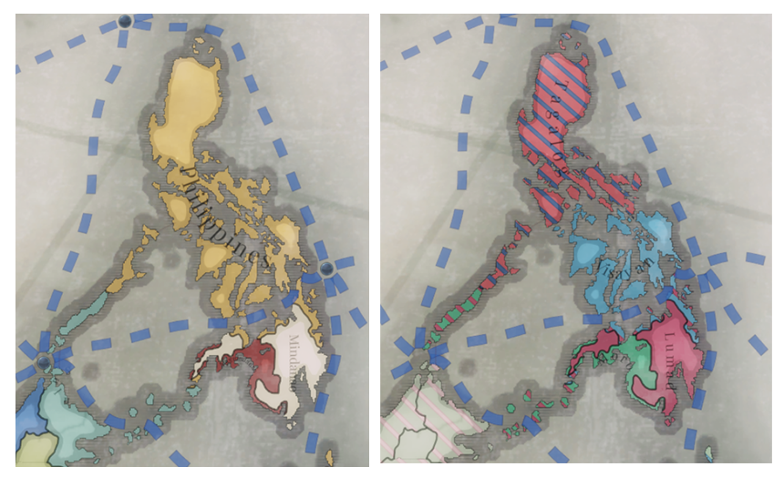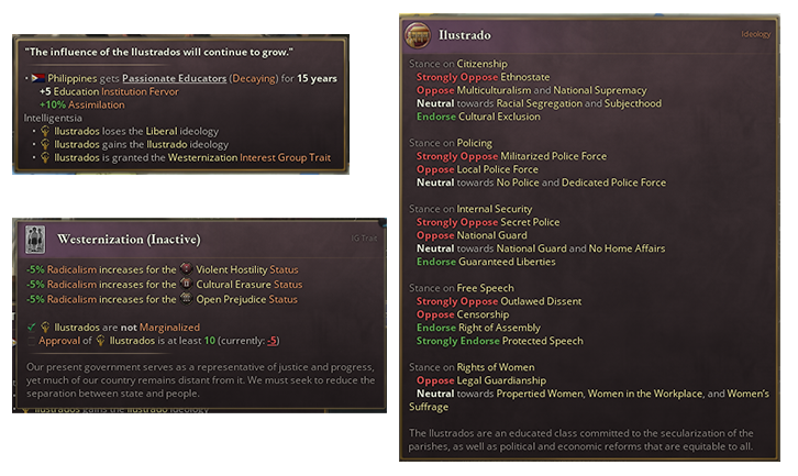 With the release of Iberian Twilight, Filipino culture will now be split at game start into Filipino Mestizo, Tagalog, Ilocano, Visayan, and the anachronistically named Lumad, a catch-all term for the various native peoples of Mindanao. Spanish will be the country's only accepted culture at game start, and the country will be primarily run by them and their Hispanophone Mestizo allies, but the situation of minority rule can be remedied by the new Philippine narrative content. Once you research nationalism, you will be presented with two new Journal Entries: