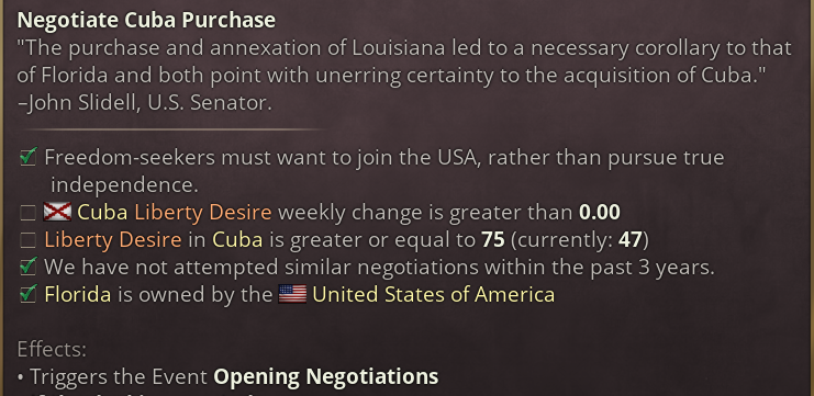 Gaining enough liberty desire, if the bar leans towards joining the USA, will allow Cuba to trigger a chain of events allowing it to be purchased from Spain. If Spain refuses, there may be diplomatic consequences.