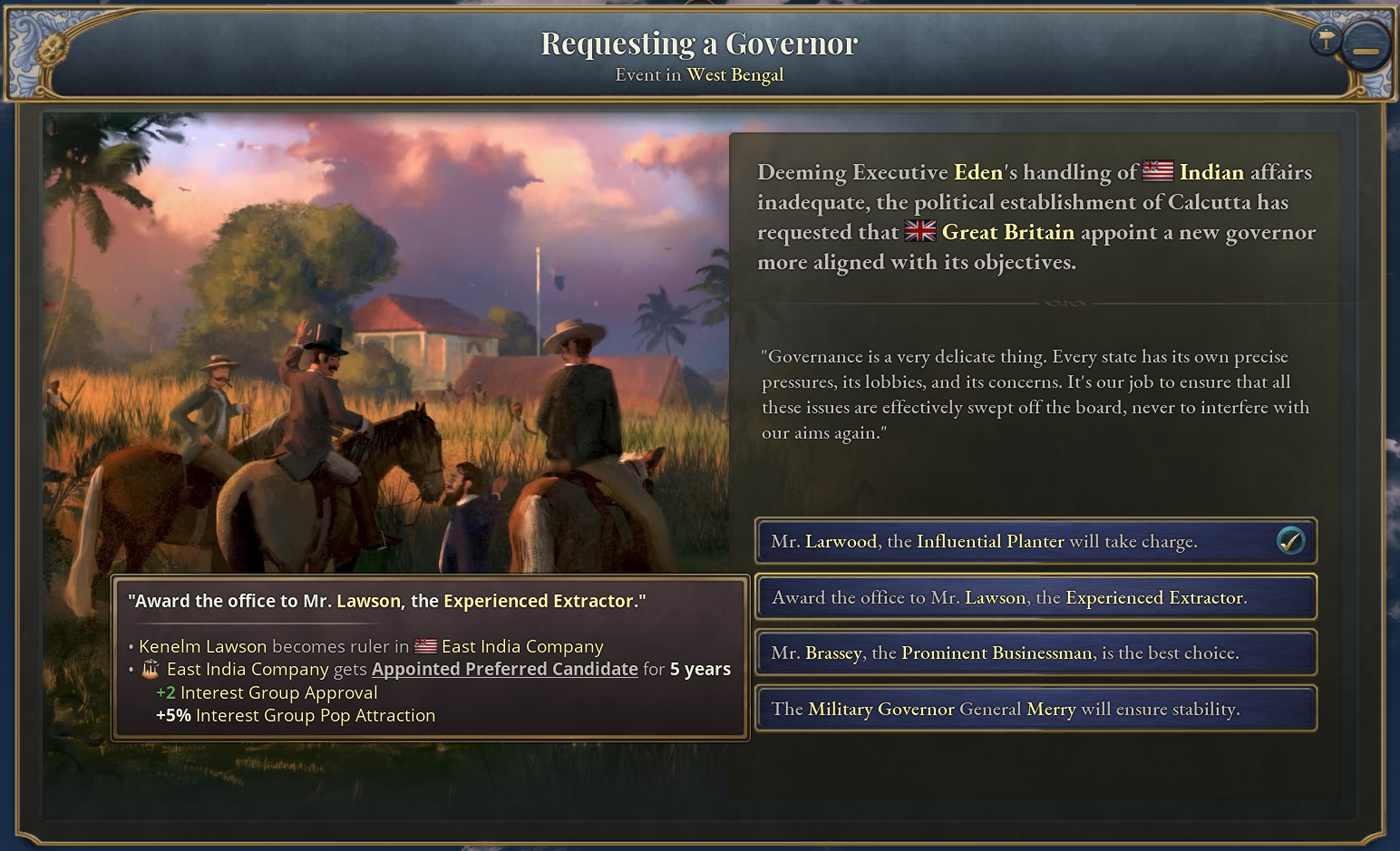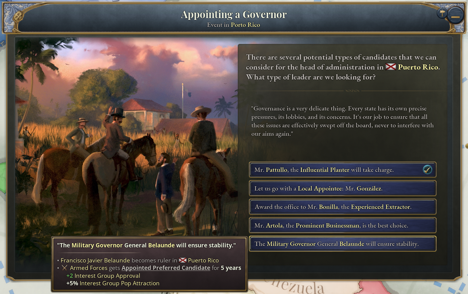 In keeping with Iberian Twilight’s content for Spanish colonial administrations, we have reworked the Appoint Governor interaction included in Sphere of Influence. This interaction now allows one to appoint one of several archetypal colonial governors to rule over one’s colonies.