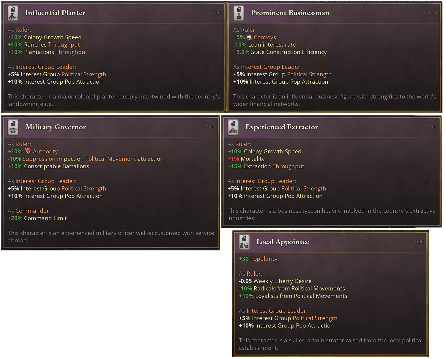 Additionally, all heads of state of colonial countries at the start of the game have been given one of these traits, which will be inherited by their successors upon the end of their terms.