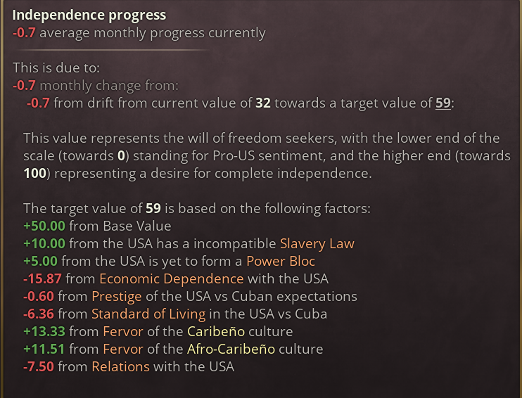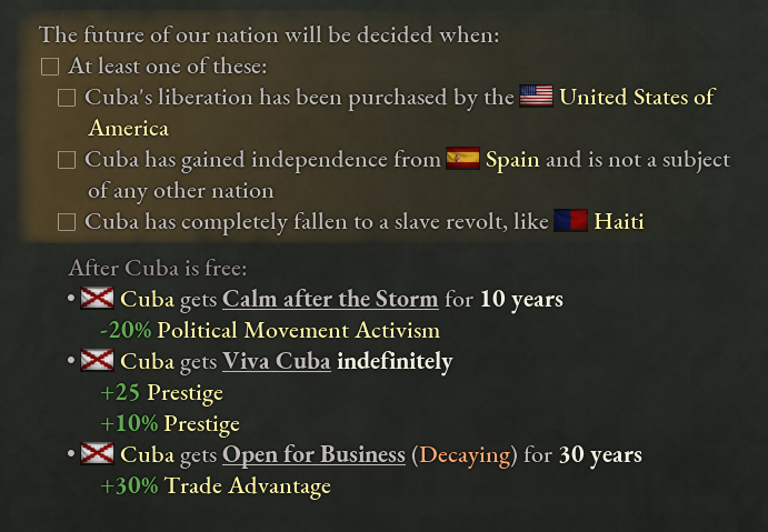 Haiti will now start the game with a rather powerful Dominican National movement operating in its lands, uniting the Spanish, Caribeños, and Afro-Caribeños under its banner. Other than the usual factors their strength is also based on your debt level, so getting your economy in order is even more of a priority now if you want to keep the rebellious east under control.