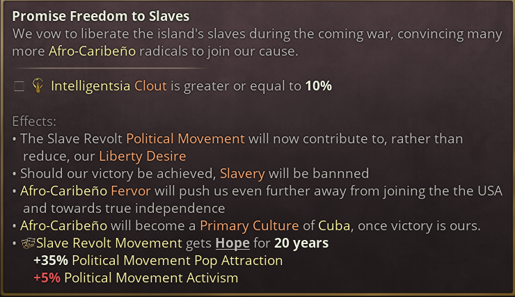 Cuban revolutionaries typically freed slaves on their farms or farms in conflict zones, some of whom would then fight. There is also an equivalent button to appeal to Afro-caribenos and integrate them as a primary culture after slavery is banned.