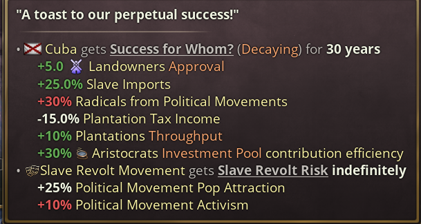 "Failing" the journal entry will allow the player to direct the country down a variety of other paths, including a boost to liberty desire or sending the signal for a slave revolt. See Dev Diary 163: The Fine Print for more details about the new slave revolt movements.