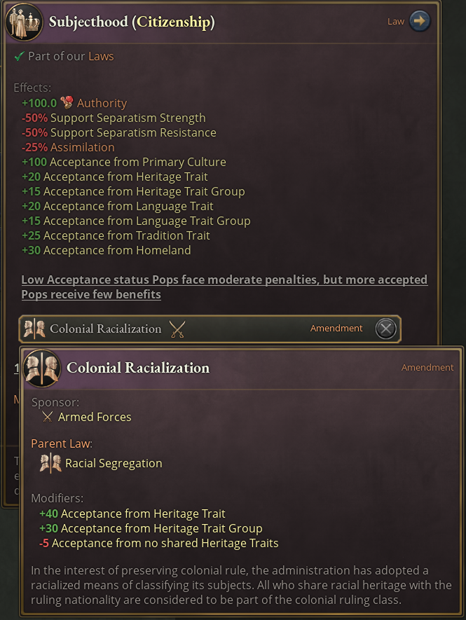 At the beginning of the game, most Colonial Administrations will have the Subjecthood law, with the Colonial Racialisation amendment attached. This law setup represents the administrative reality of colonial administration – whilst colonised peoples were discriminated against by the administration, the practical dimension of this discrimination was different from a minority populace surrounded by a hostile majoritarian society. In India, for example, the hostility of the British authorities towards Indians took the form of a paranoid, exclusionary state apparatus whose engagement with the populace was minimal outside of violent reprisals. For more in-depth information on the system, refer to Dev Diary #136.