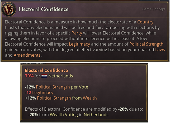As it turns out, our team is extremely enthusiastic about electoral fraud. In the time since the diary in which it was initially revealed, we have developed a way to generalise it to all nations. All countries with elections now have an Electoral Confidence value, which reflects the degree of confidence its politically enfranchised populace has in elections being free and fair. Having a low Electoral Confidence negatively impacts one’s Legitimacy, and replaces Political Strength from Votes with Political Strength from Wealth. The penalty from having low Electoral Confidence is offset by a more restricted franchise, and other modifiers.