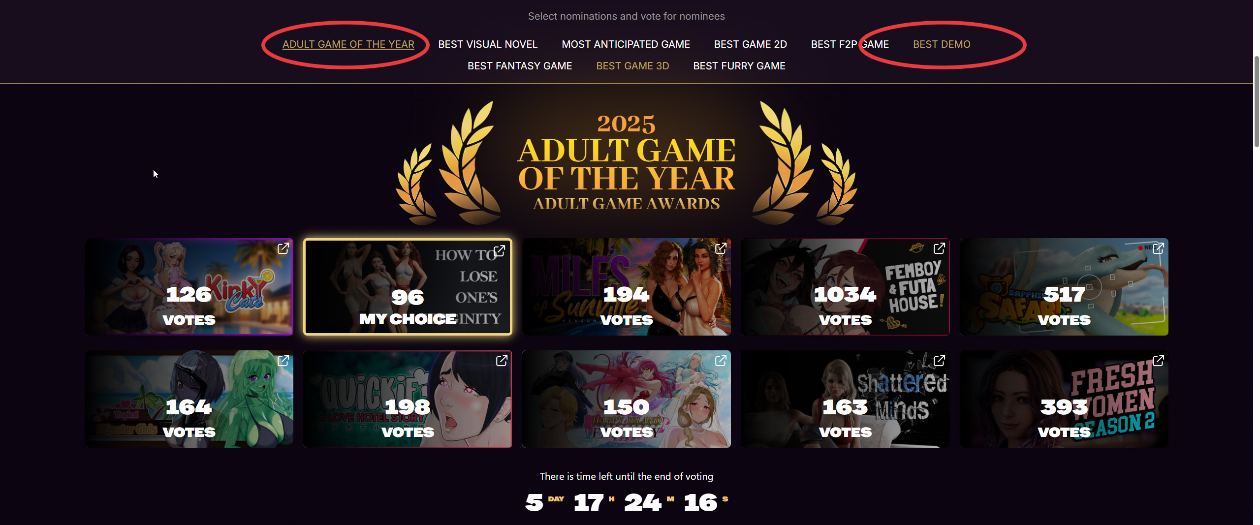 My games are in the “ADULT GAME OF THE YEAR” and “BEST DEMO” nominations.