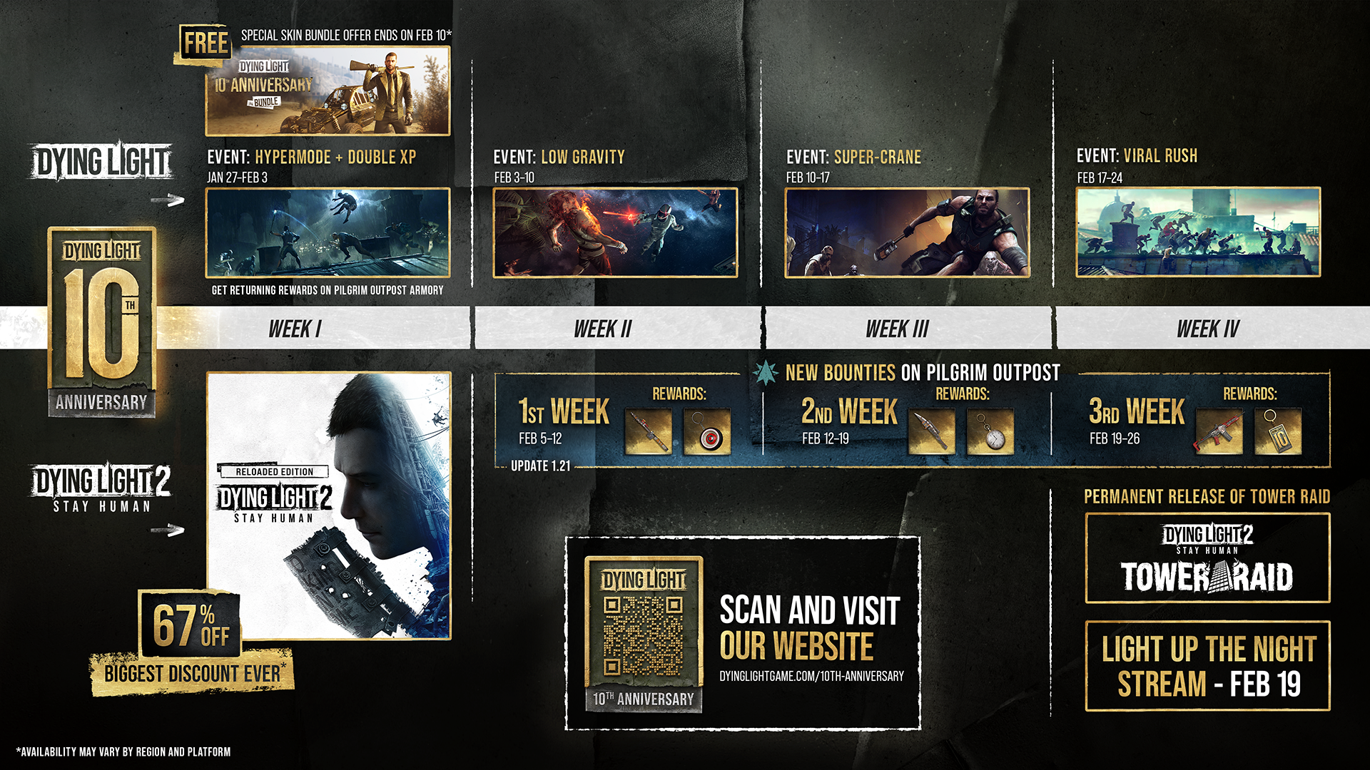 In honor of our 10th Anniversary, we wanted to celebrate the legacy of the franchise with a time-limited offer. Fans of the original Dying Light can now get the 10th Anniversary Bundle for free on Steam until February 10.