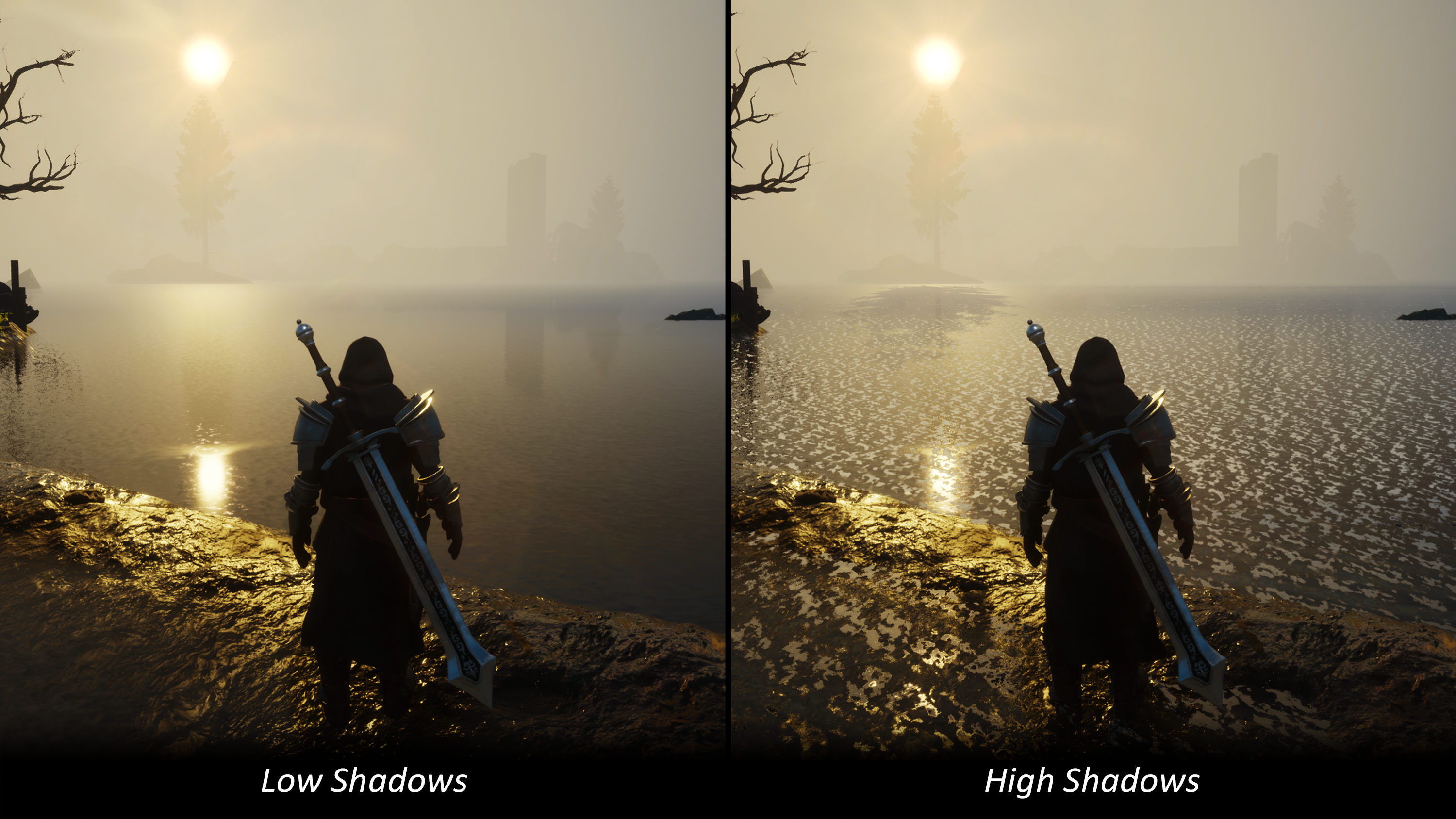 This strange effect appeared only when shadows were set to their lowest setting and it took a lot of trial and error to figure out a solution. Ultimately, we ended up discovering the root cause (an issue with how shadows play with refraction in UE4, for those wondering), and thus, the water returned to normal.